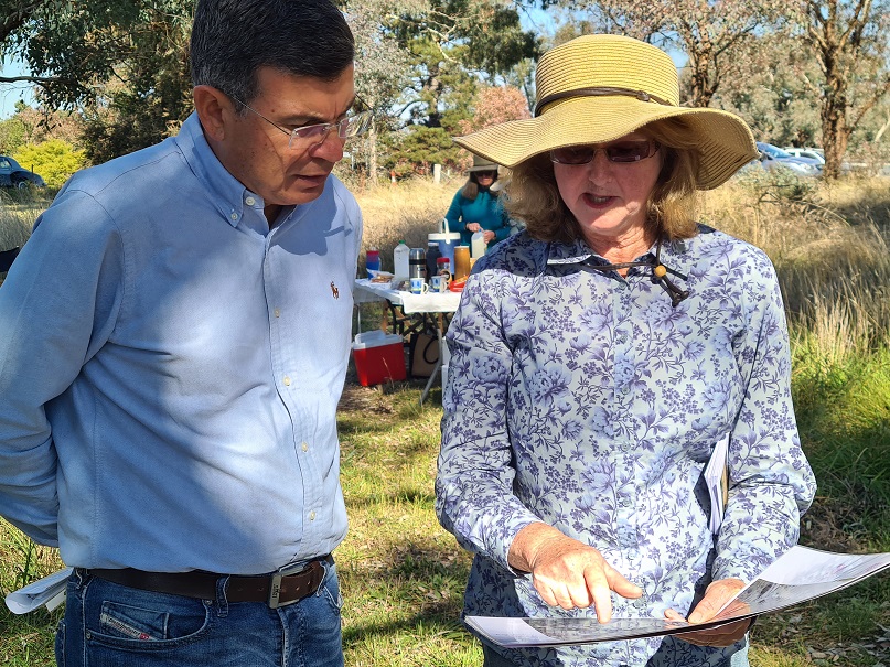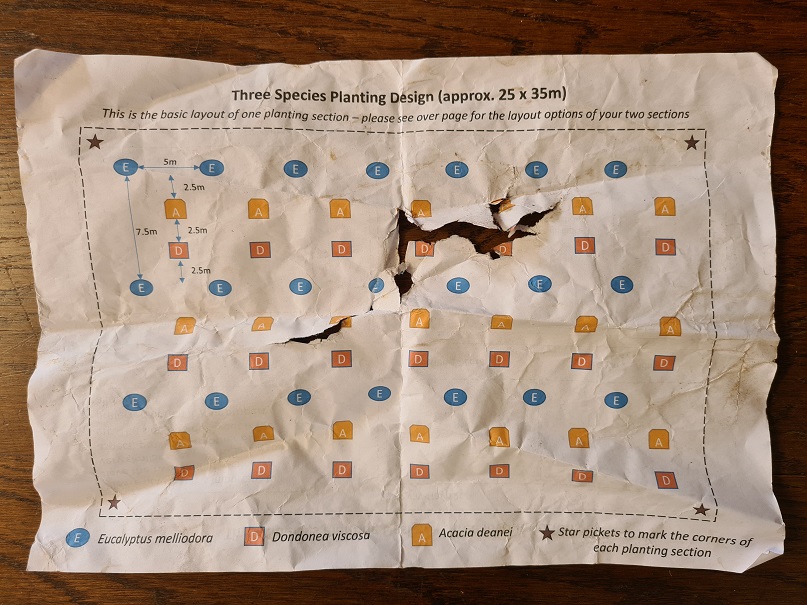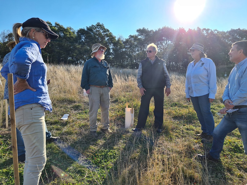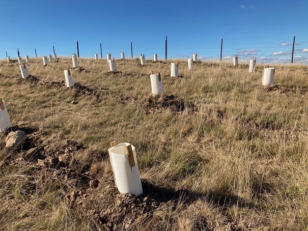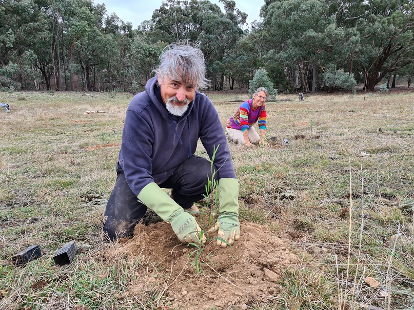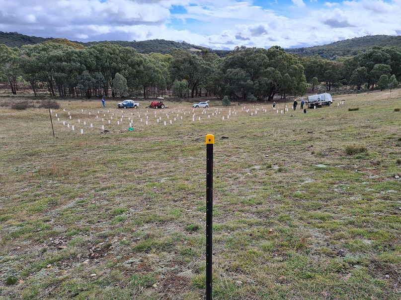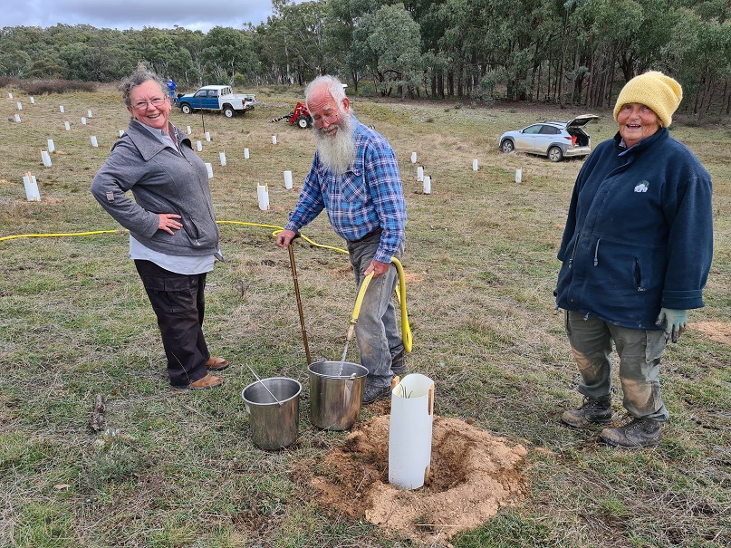 A small group of enthusiastic volunteers helped to plant 126 native trees and shrubs at Rugosa between Gunning and Murrumbateman this morning. Everything was planted, watered, and protected with tree guards in just half a day. John augered the holes with a tractor which made the work easy, and we were then able to relax over a delicious lunch made by Michelle. This is one of several supporting trial sites in the Climate Ready Revegetation Project which will help us to understand the survival of plants grown from local seed versus plants grown from seed from other climates.